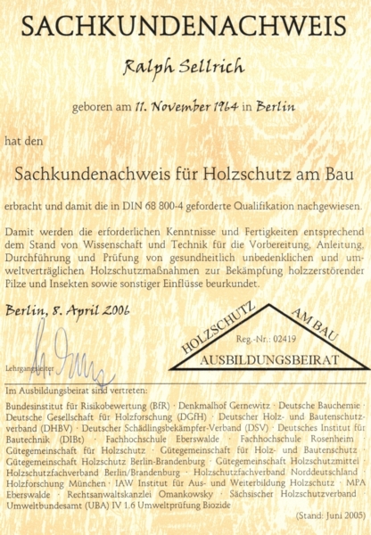 eingehalten werden. Z.B. werden 1,00 m über dem letzten festgestellten Befall angrenzende Zonen mit Holzschutzmittel